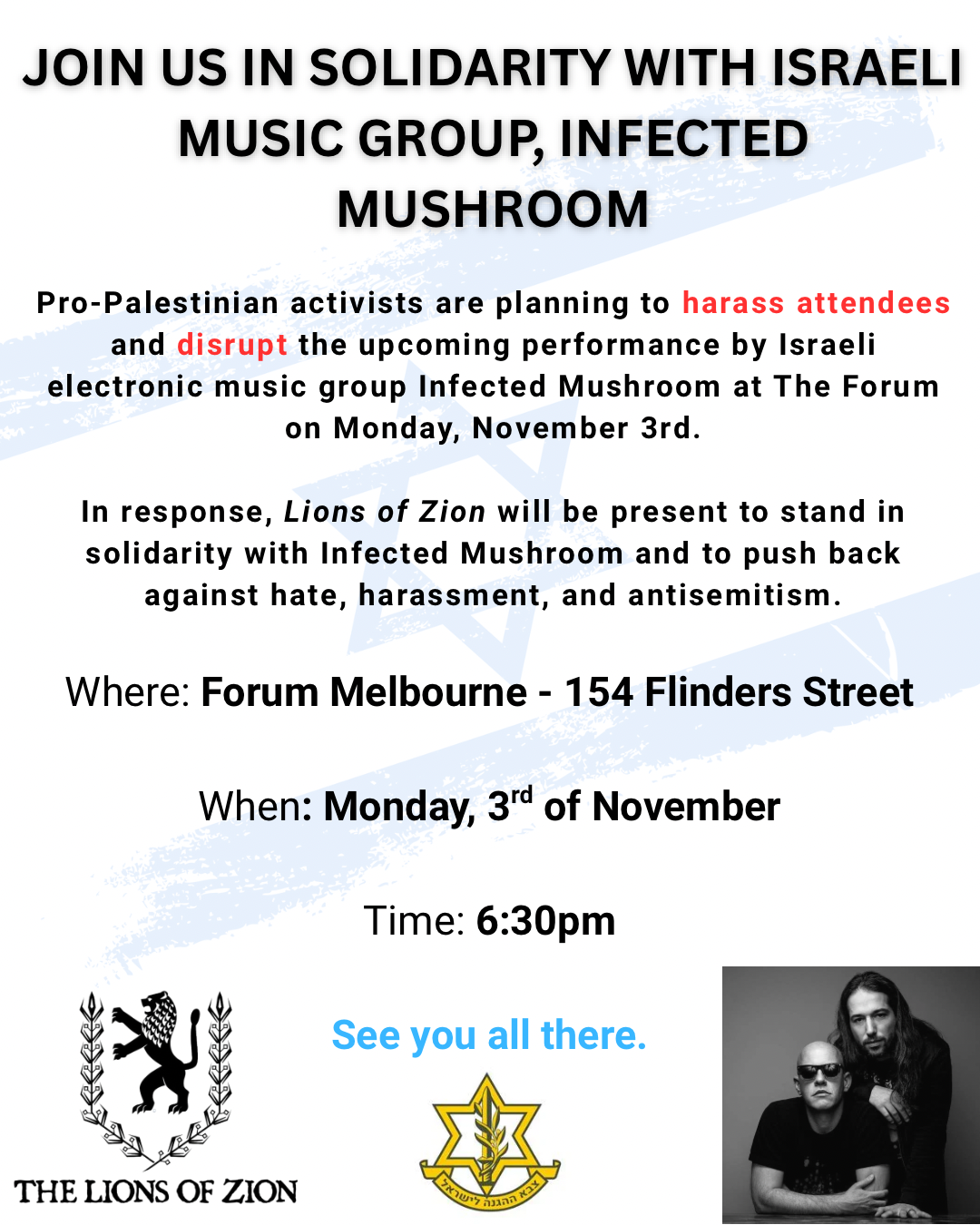 Join Lions of Zion this Monday, November 3rd at The Forum to stand in solidarity with Infected Mushroom and against antisemitism, harassment, and intimidation.